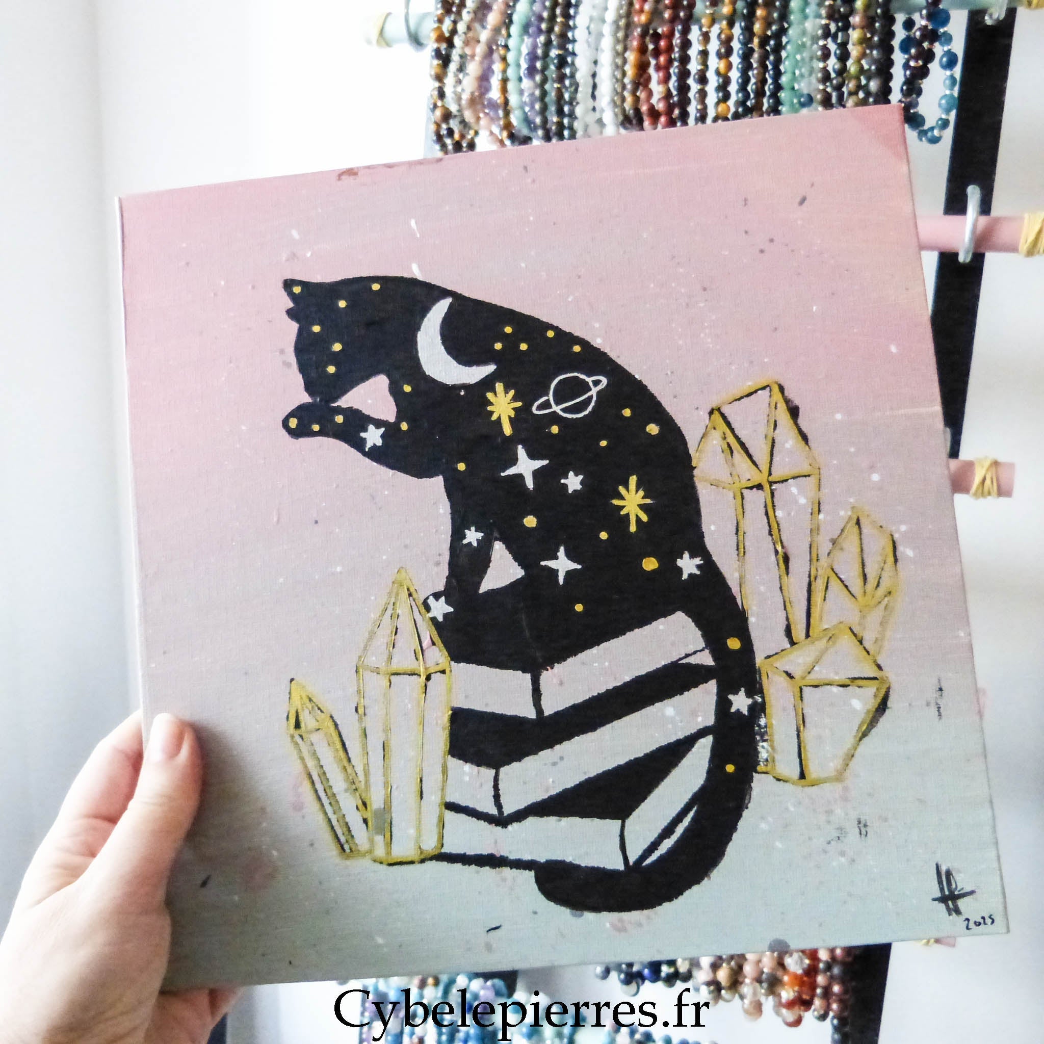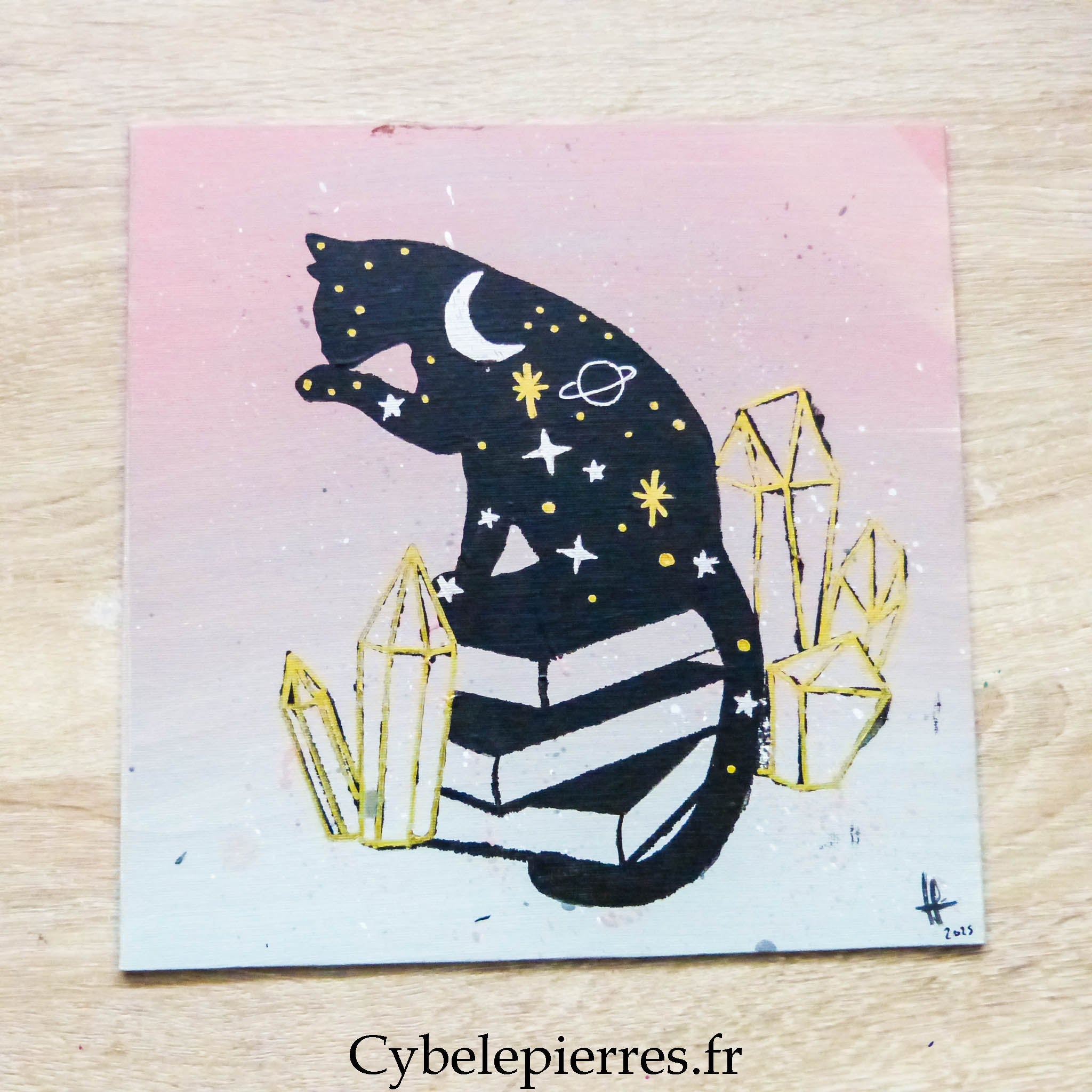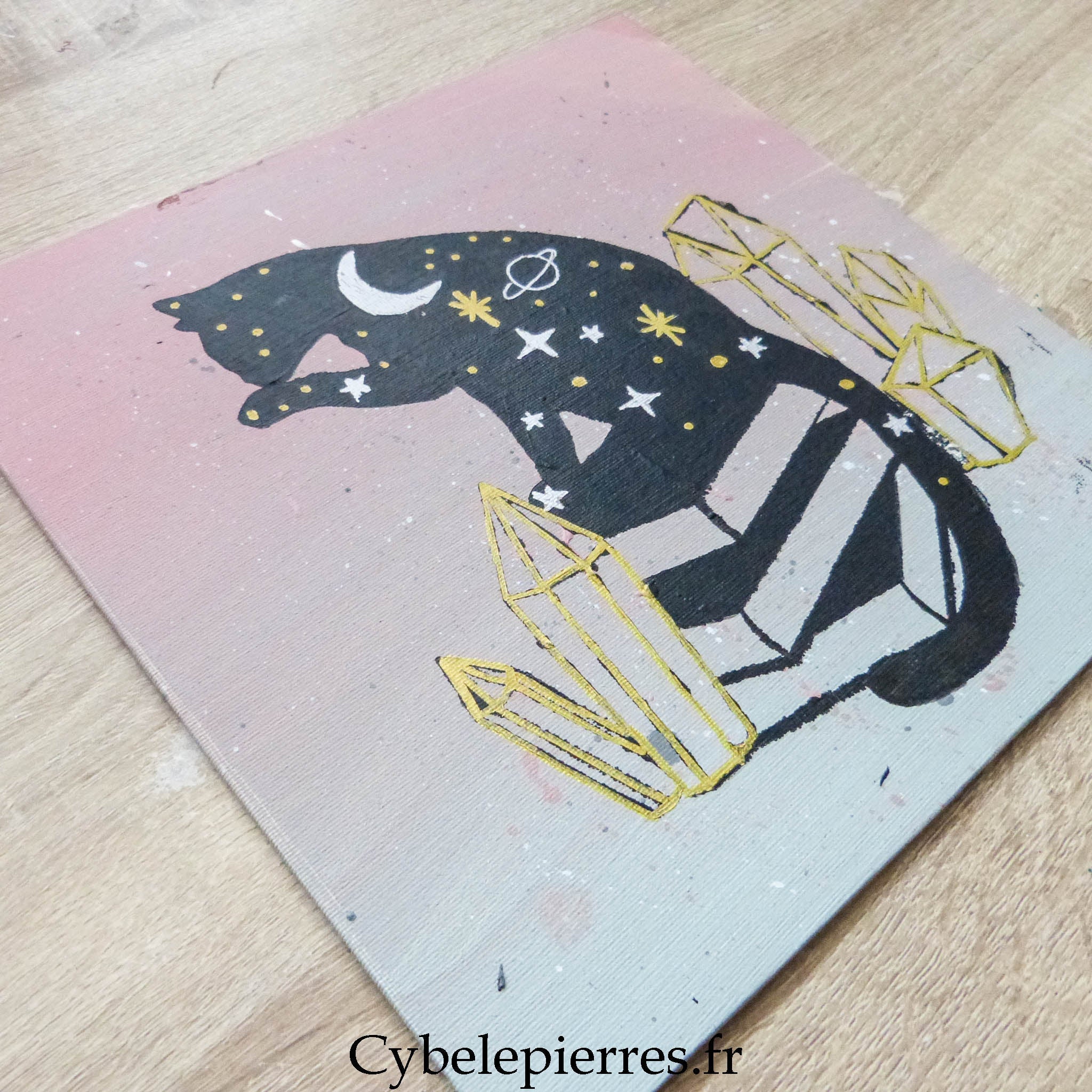 Le fond est peint à l’acrylique dans des dégradés doux rose et bleu, sur lequel est dessiné un chat noir galactique, parsemé d’étoiles, de planètes et d’une lune, entouré de cristaux dorés graphiques.