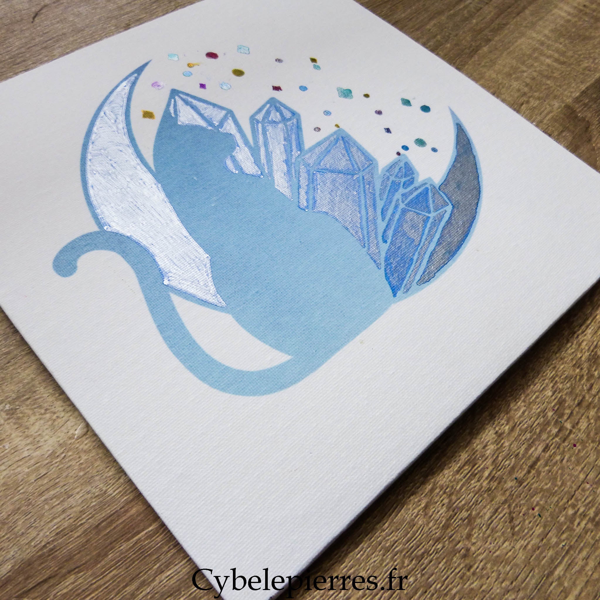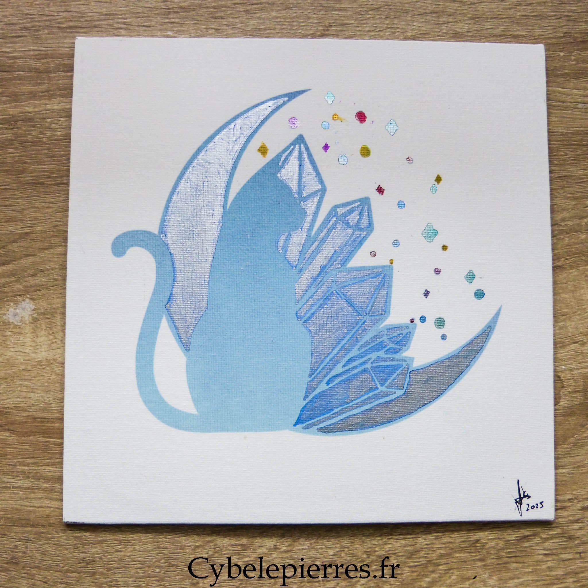 Tableau original au format 25×25 cm, représentant un chat bleu stylisé entouré de cristaux lumineux et de poussières d’étoiles multicolores.