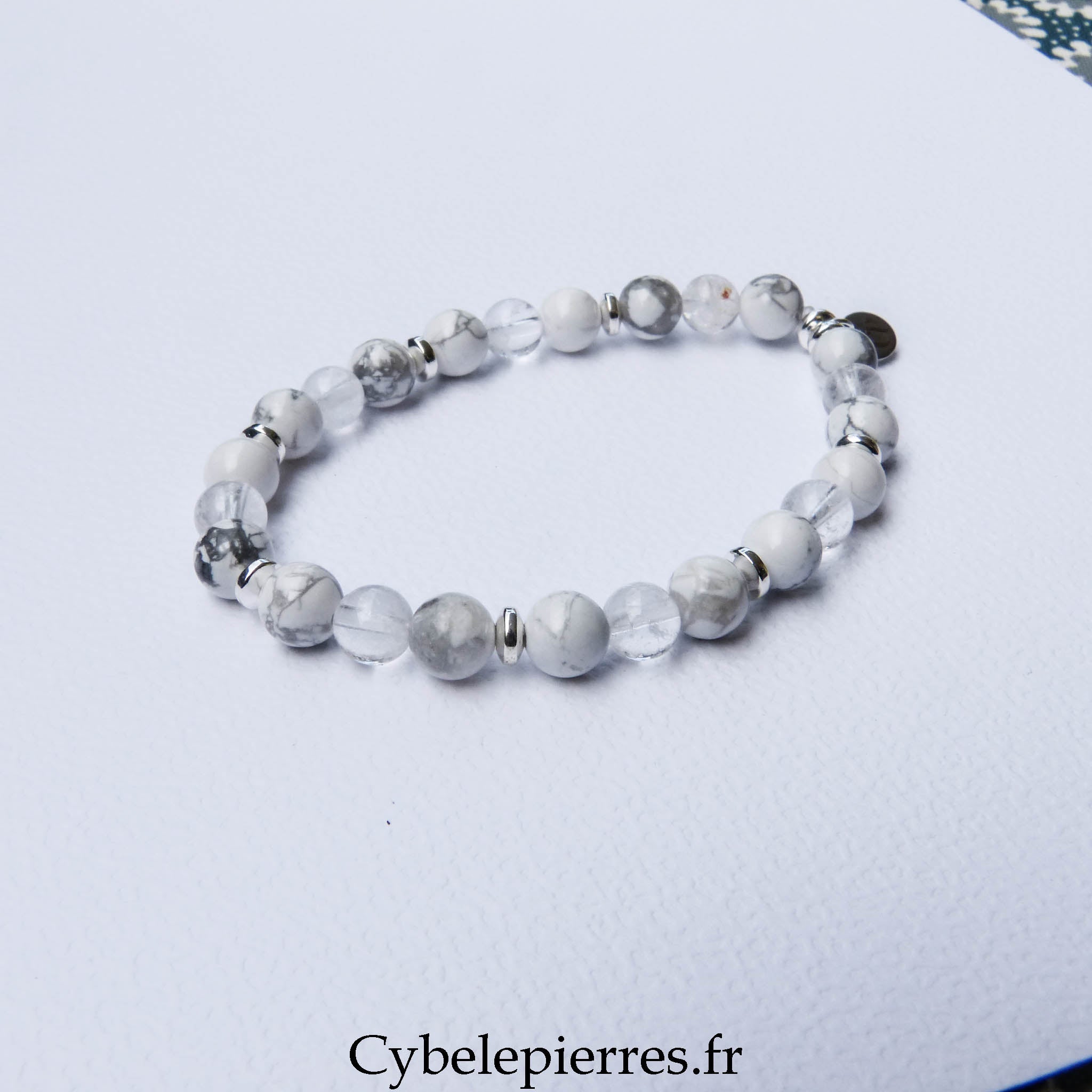 Bracelet composé de perles de 6 mm en cristal de roche et howlite, monté sur un fil élastique résistant, fait main.