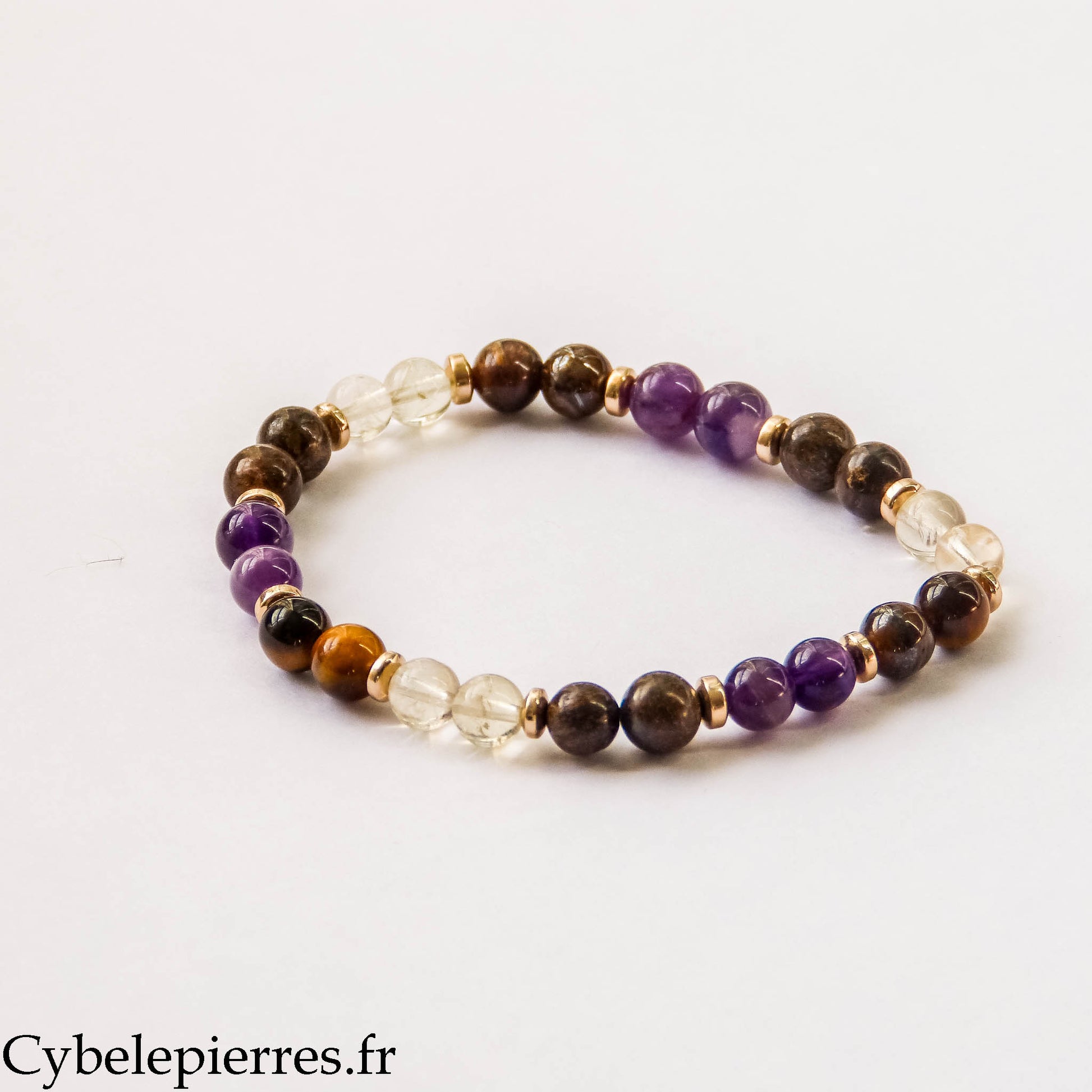 Bracelet Sagesse Lumineuse – Améthyste, Œil de tigre, Bronzite et Citrine (6 mm) – 18 cm | Lucidité et Équilibre
