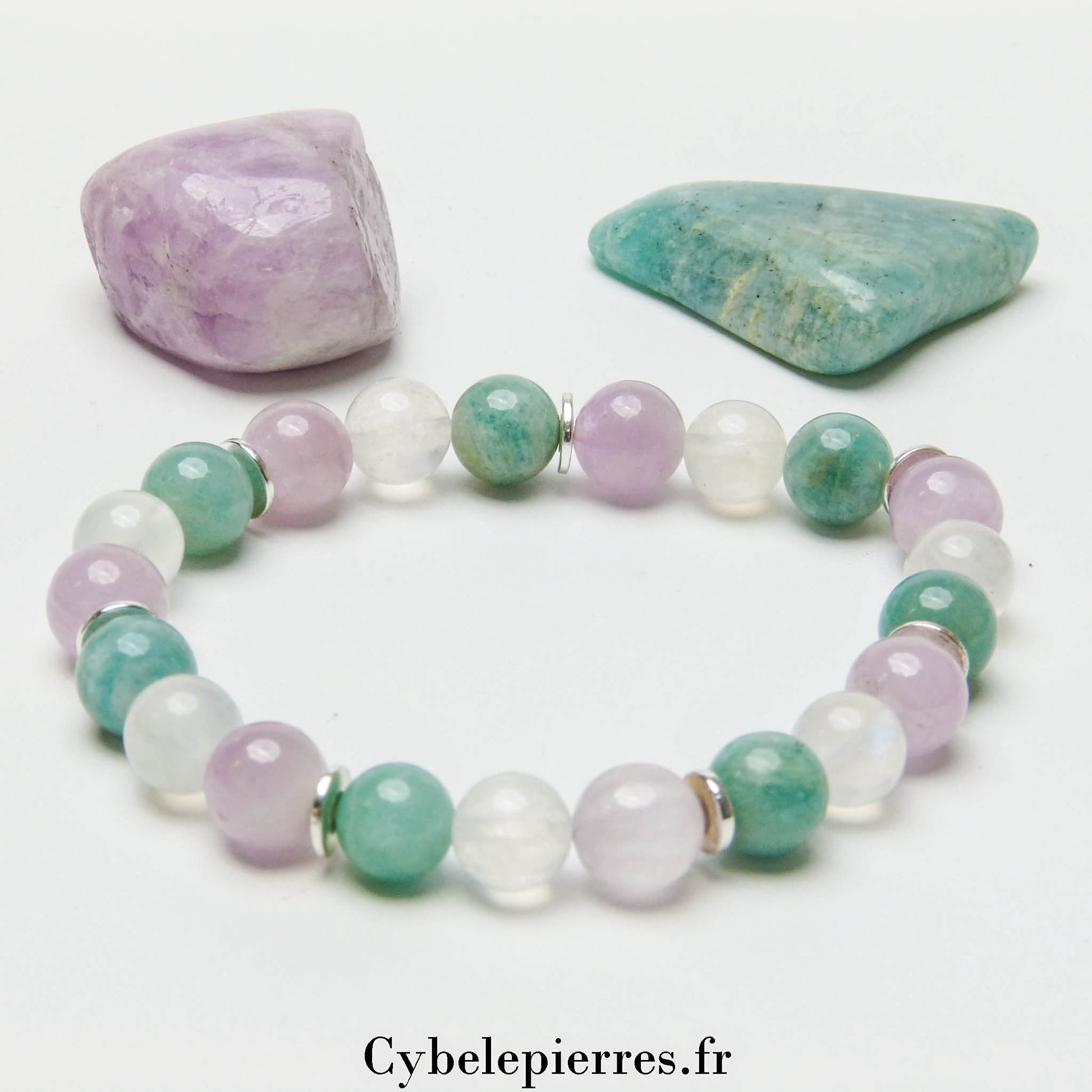 Ce bracelet en pierres naturelles allie la Kunzite, la Péristérite (Labradorite Blanche) et l’Amazonite, offrant une énergie douce et réconfortante, idéale pour la sérénité émotionnelle et l’équilibre intérieur.