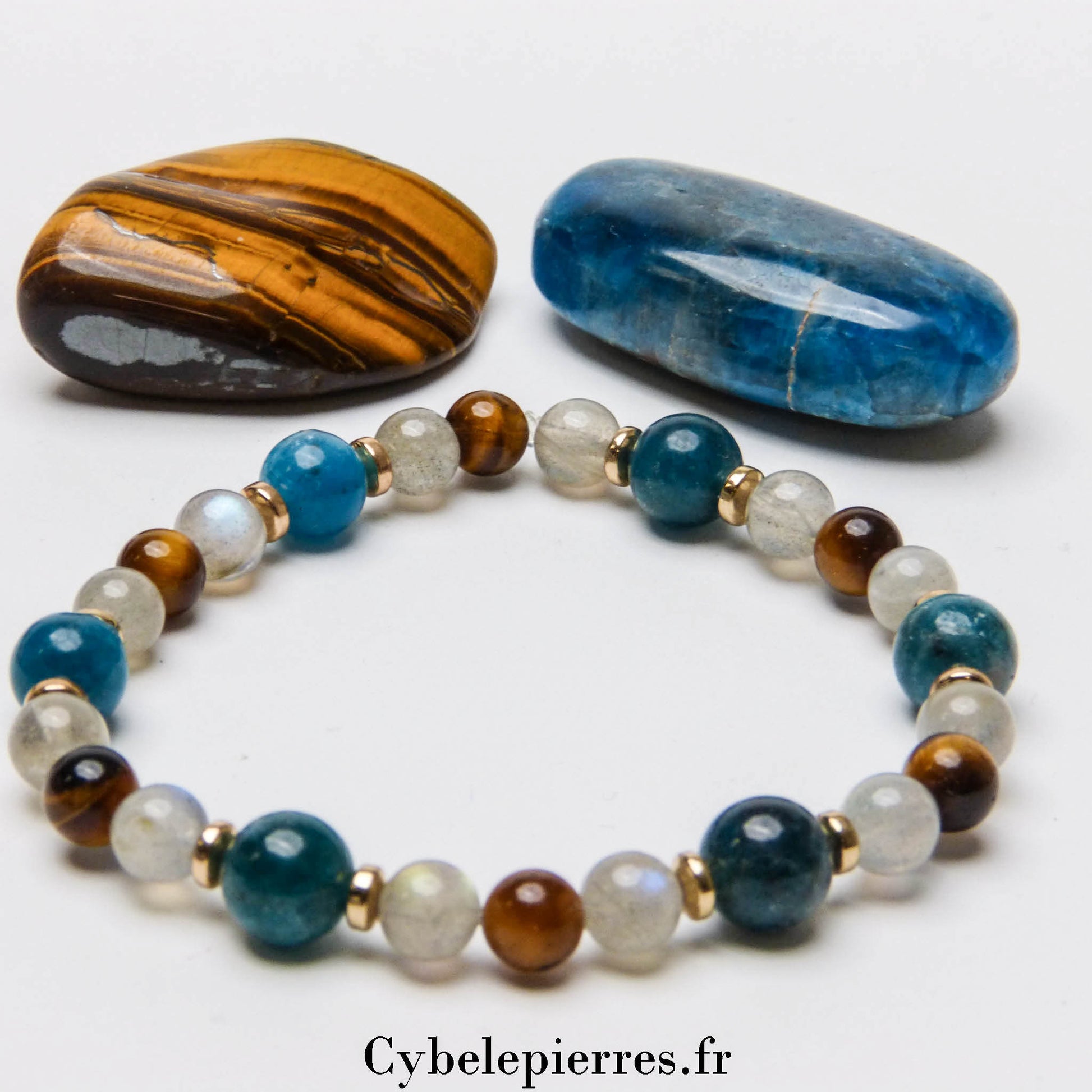 Ce bracelet Précieux, en perles de 8 mm en apatite bleue et 6 mm en labradorite et œil de tigre, associe clarté mentale, intuition et protection énergétique.