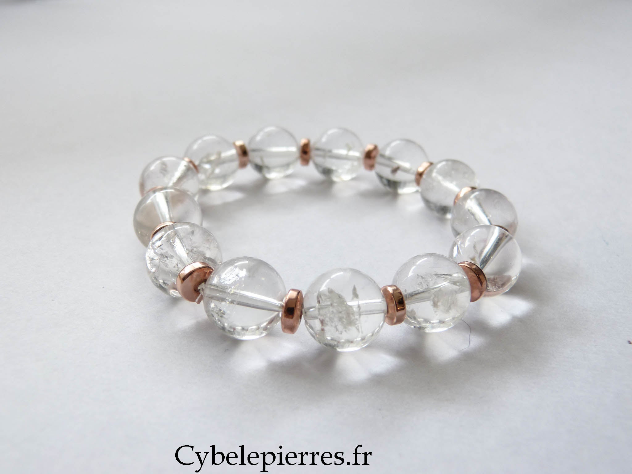 Bracelet en pierres naturelles composé de perles de 12 mm en cristal de roche, monté sur fil élastique.