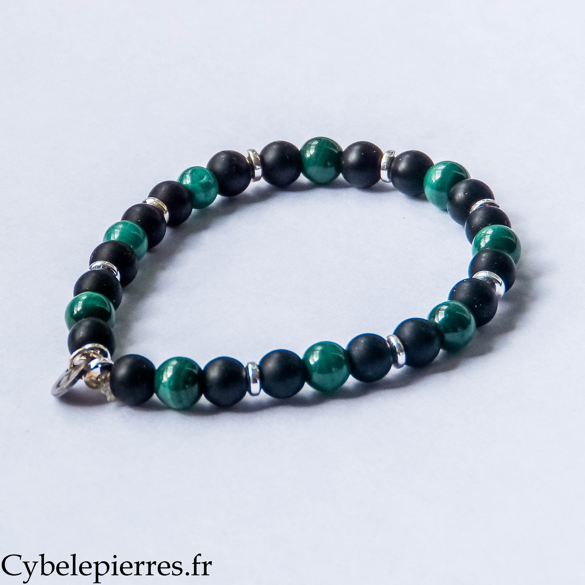 Un bracelet équilibré associant la malachite, pierre de transformation, et l’onyx, symbole de force et d’ancrage.