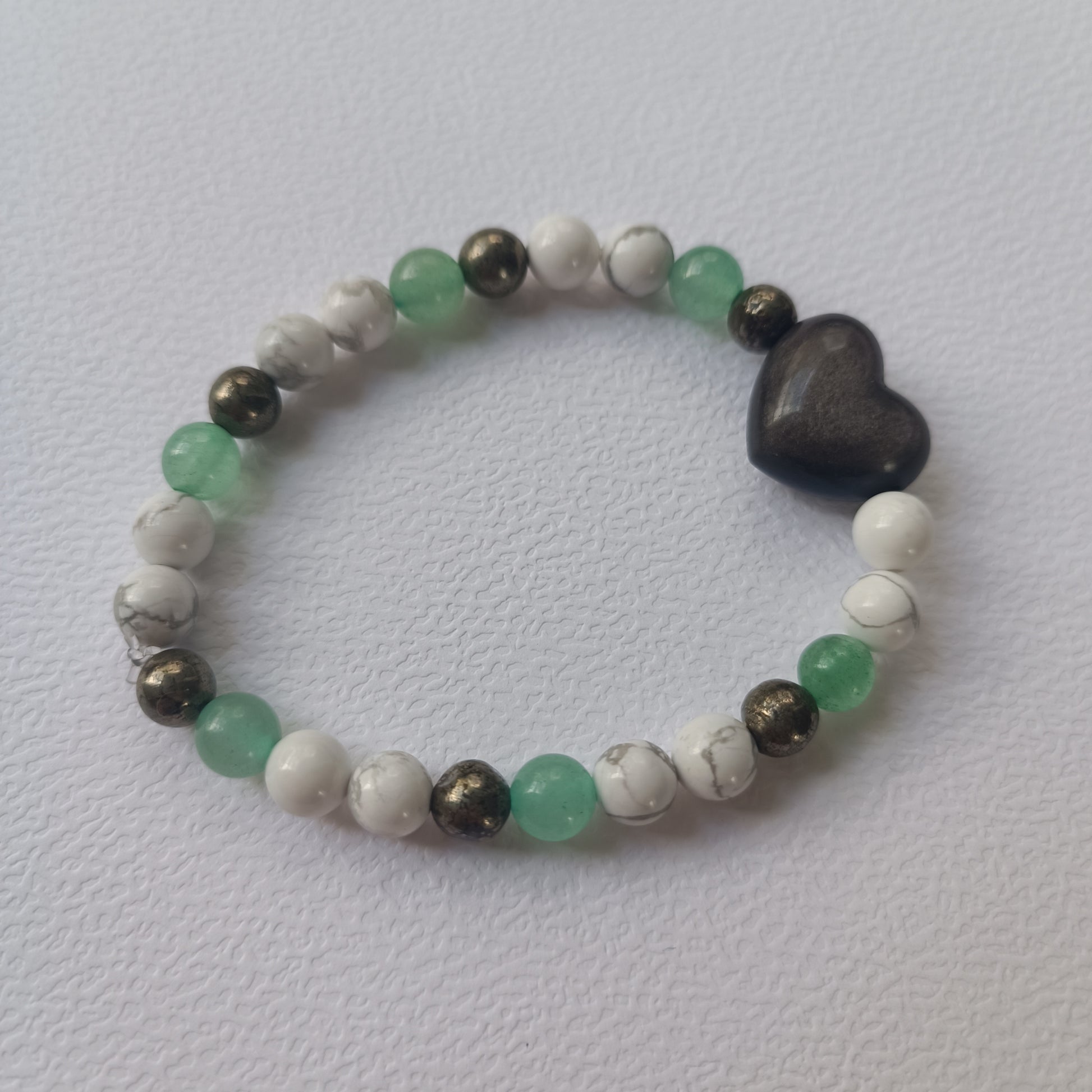 Un bracelet composé de perles de 6 mm en pyrite, howlite et aventurine verte, accompagné d’un cœur en obsidienne argentée, monté sur un fil élastique solide.