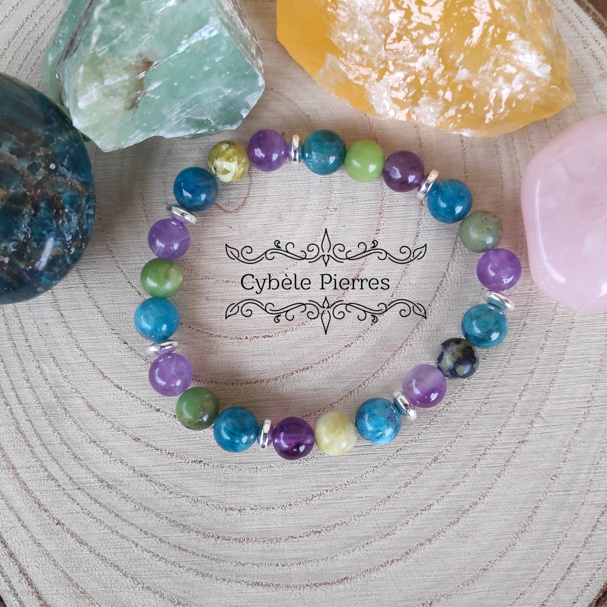 Bracelet Bienveillance - Apatite bleue, Variscite et Améthyste (8mm) - 18cm