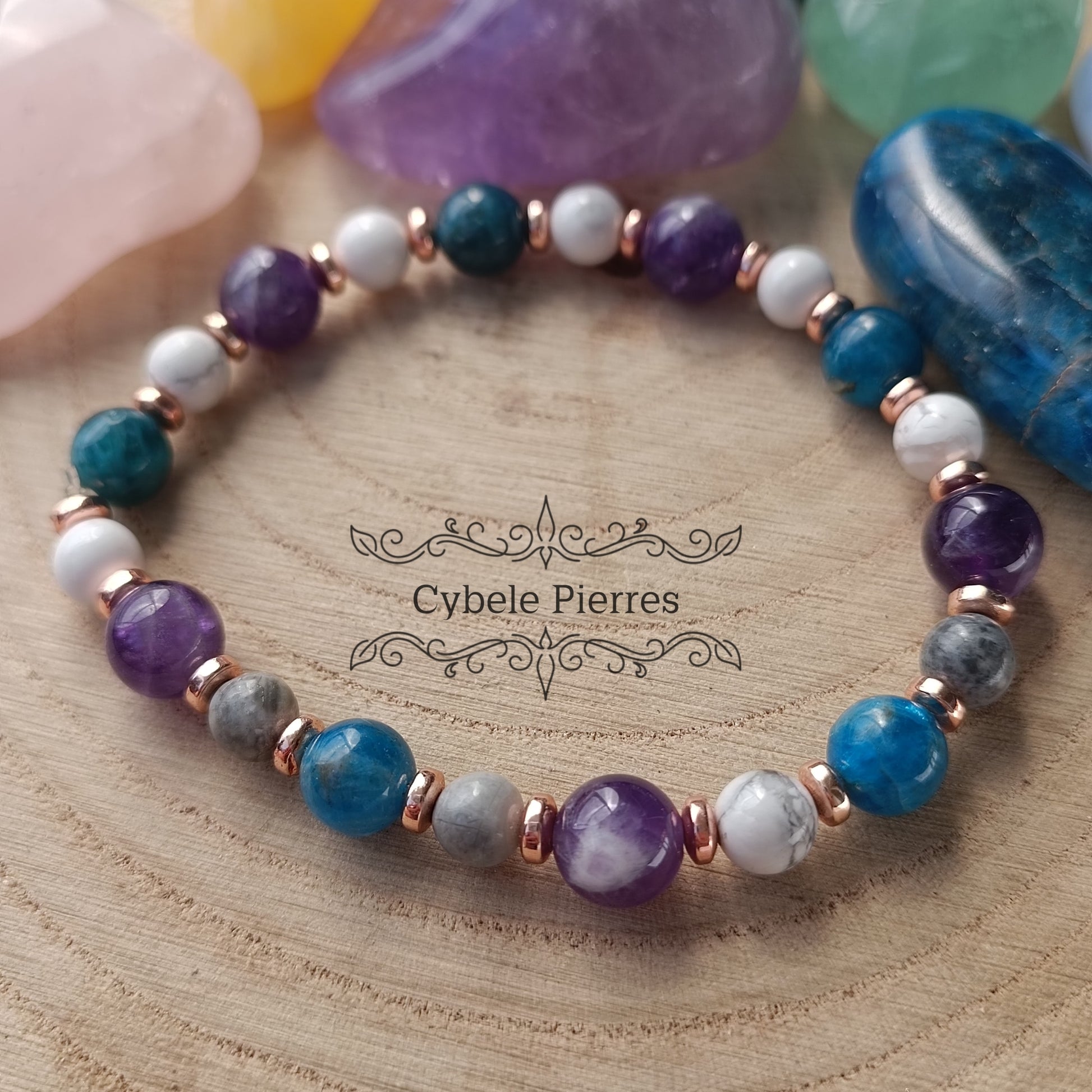 Ce bracelet en Améthyste, Apatite Bleue et Howlite est conçu pour harmoniser l’esprit et apaiser les émotions. Il favorise la clarté mentale, le lâcher-prise et la communication fluide, tout en aidant à surmonter les tensions et le stress.