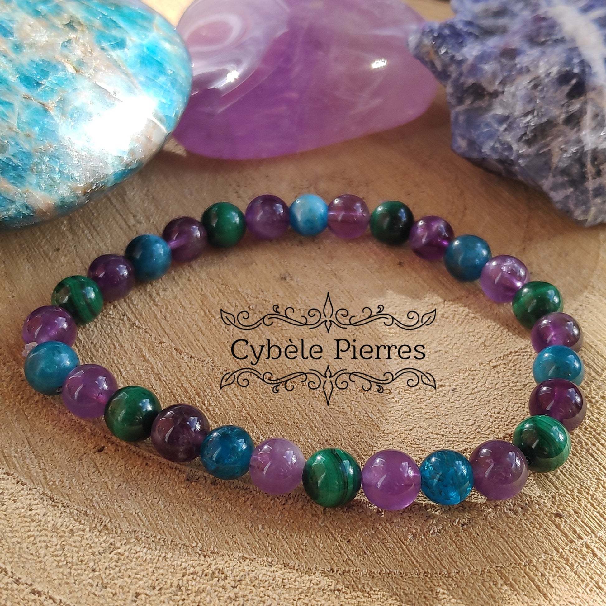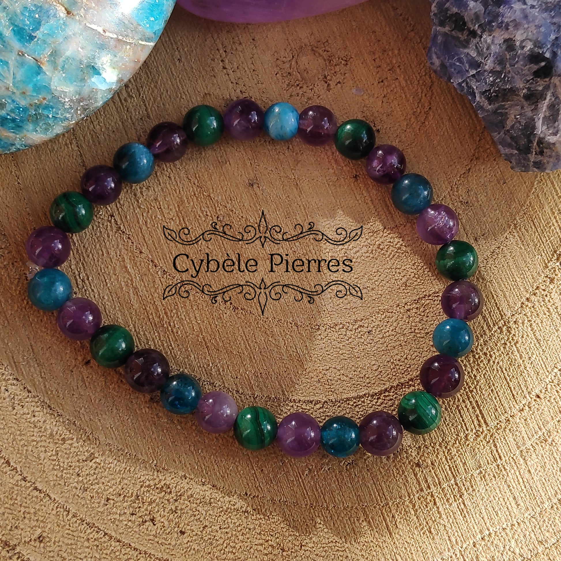 Bracelet Féerie : Améthyste, Malachite et Apatite bleue (6mm) - 17cm