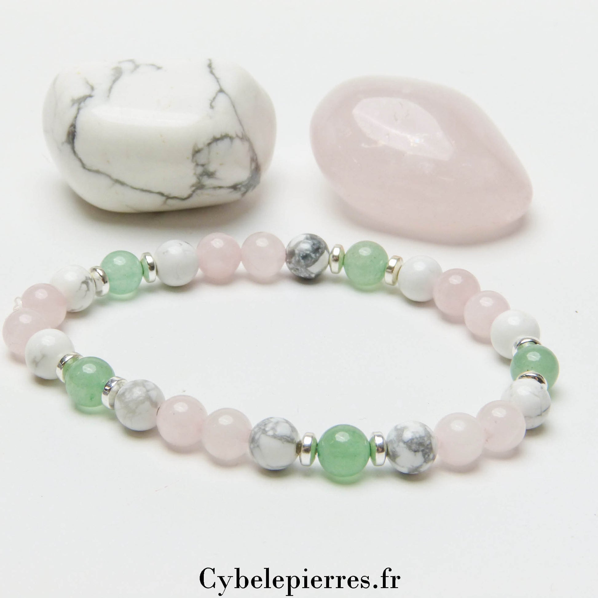 Le bracelet Sincérité, en perles de 6 mm, associe l’aventurine verte, le quartz rose et la howlite, trois pierres qui favorisent l’harmonie émotionnelle, l’apaisement et la communication sincère.