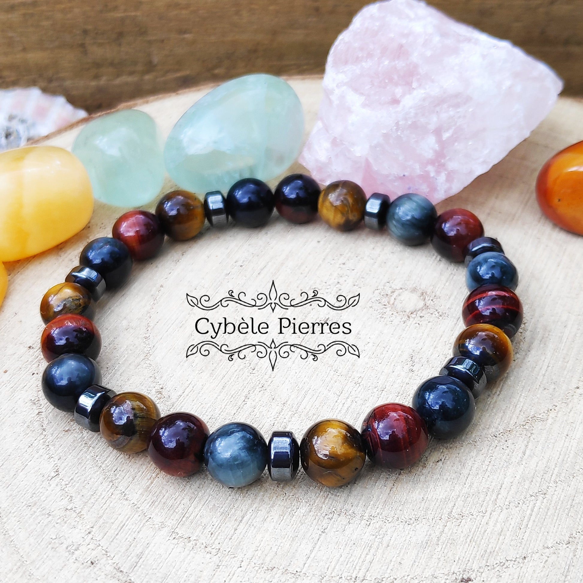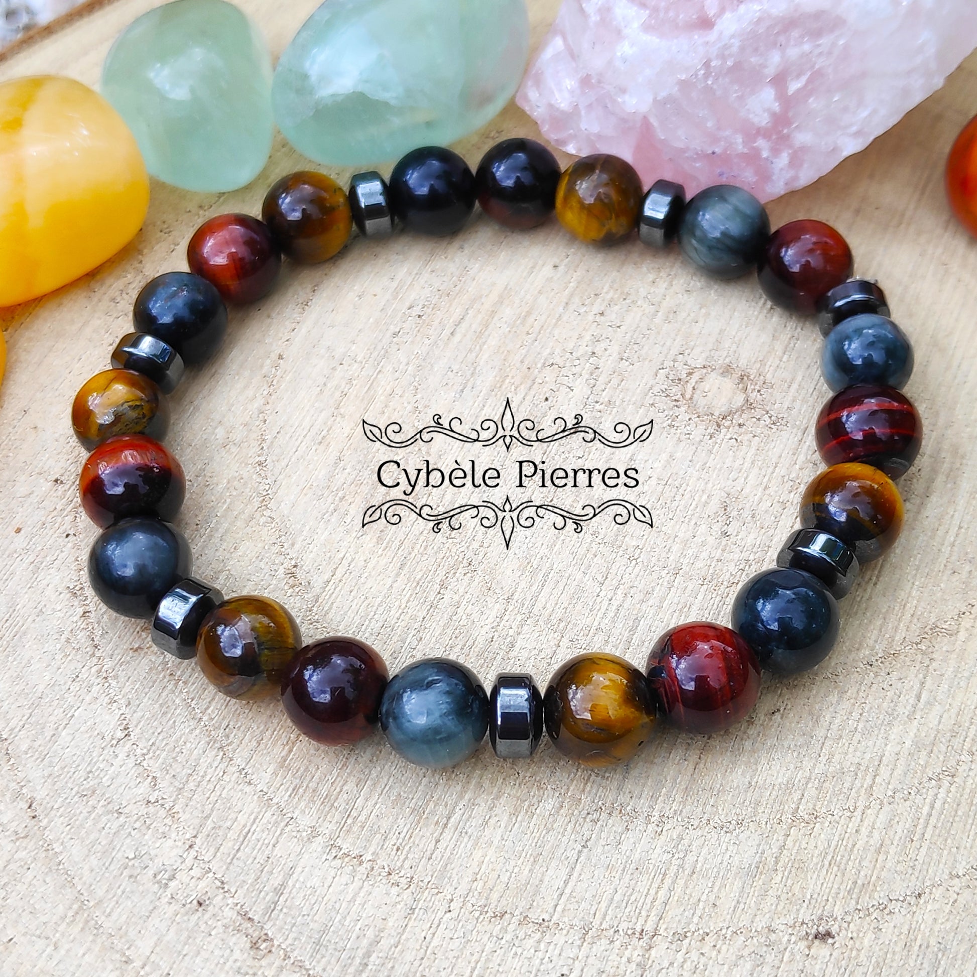 Ce bracelet Triple Protection, en perles de 8 mm, associe l’œil de faucon, l’œil de tigre et l’œil de taureau, trois pierres puissantes pour l’ancrage, la clarté d’esprit et la confiance en soi.