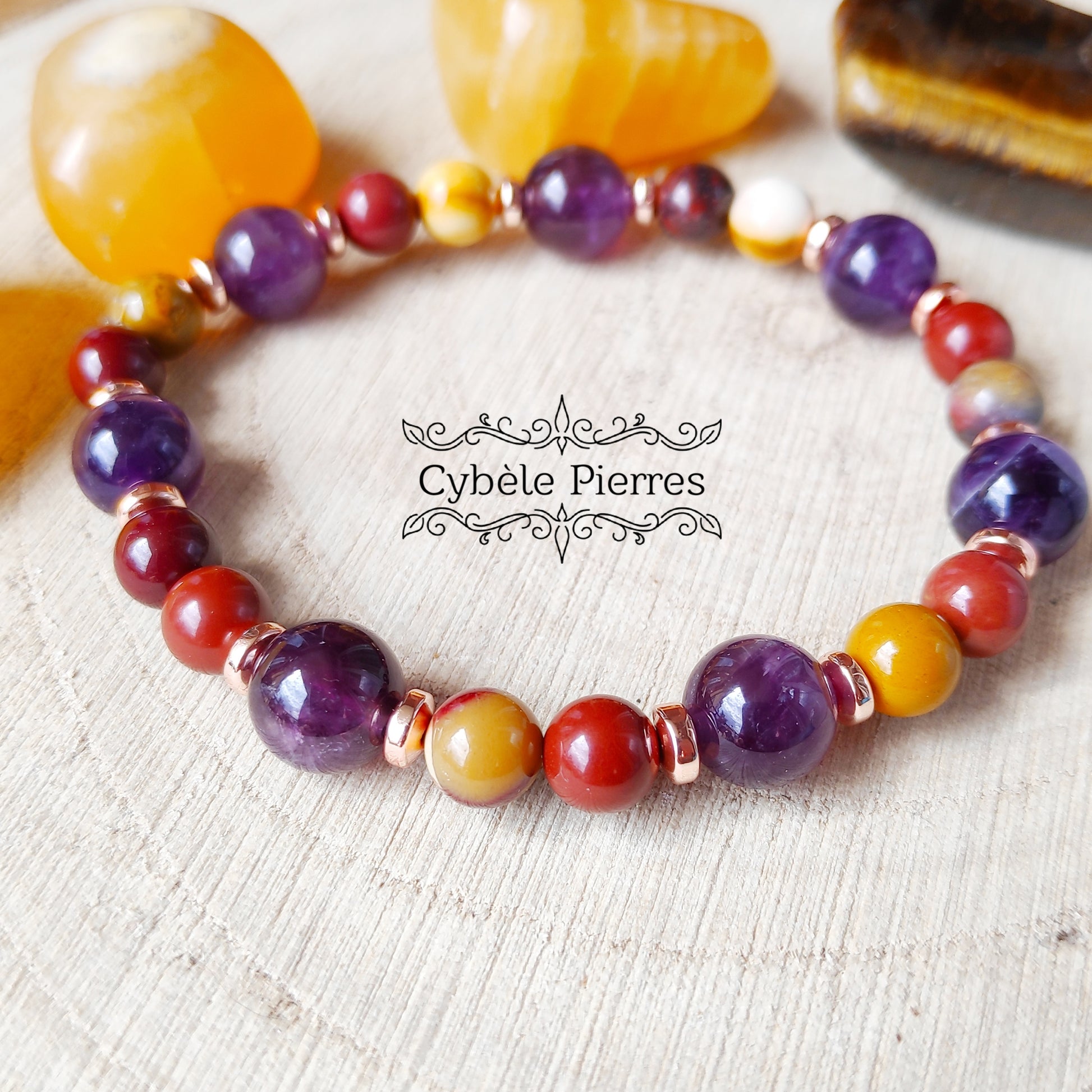 Ce bracelet Nouvelle Vie, en perles de 6 mm en mookaite et 8 mm en améthyste, est conçu pour accompagner le changement, la prise de décision et l’épanouissement personnel.