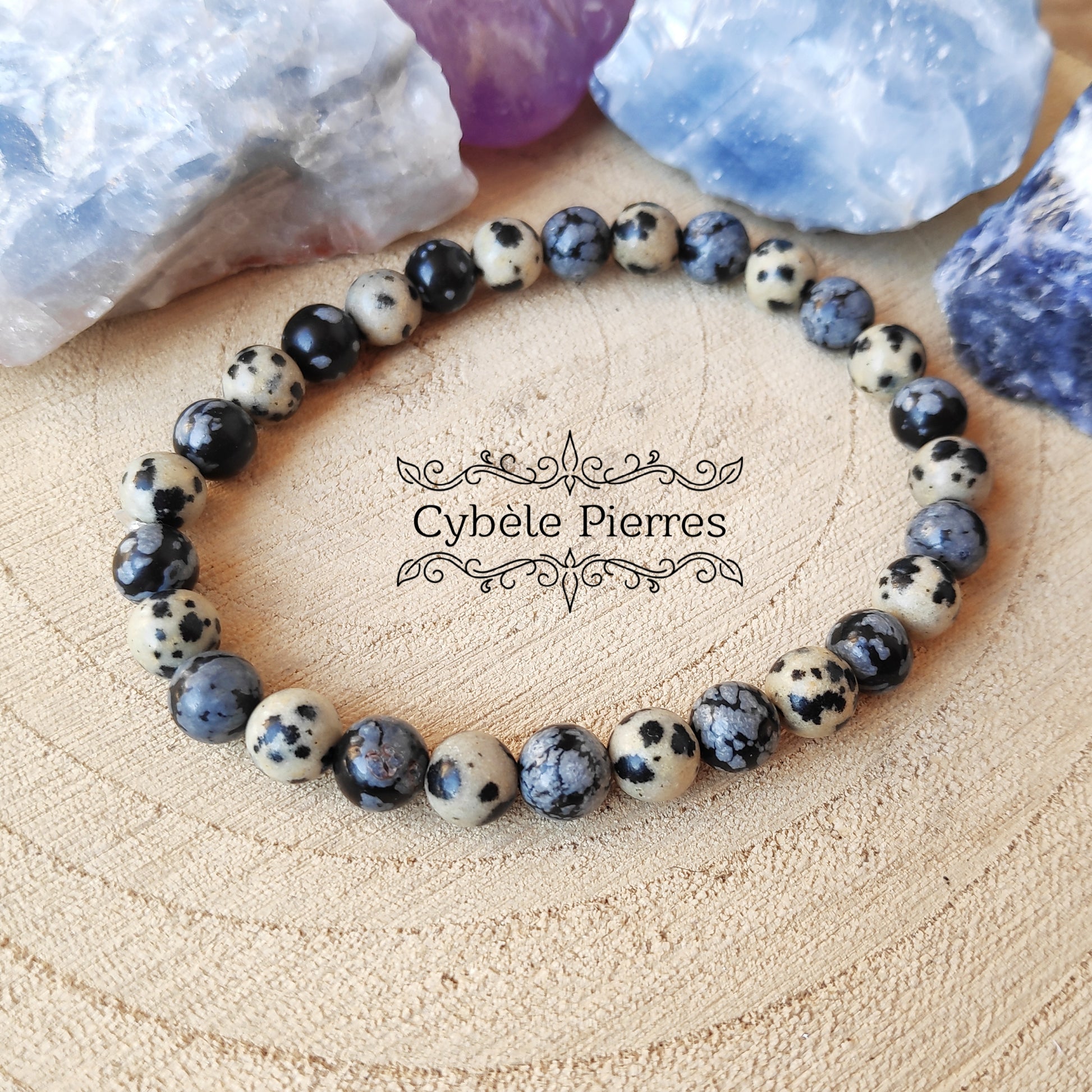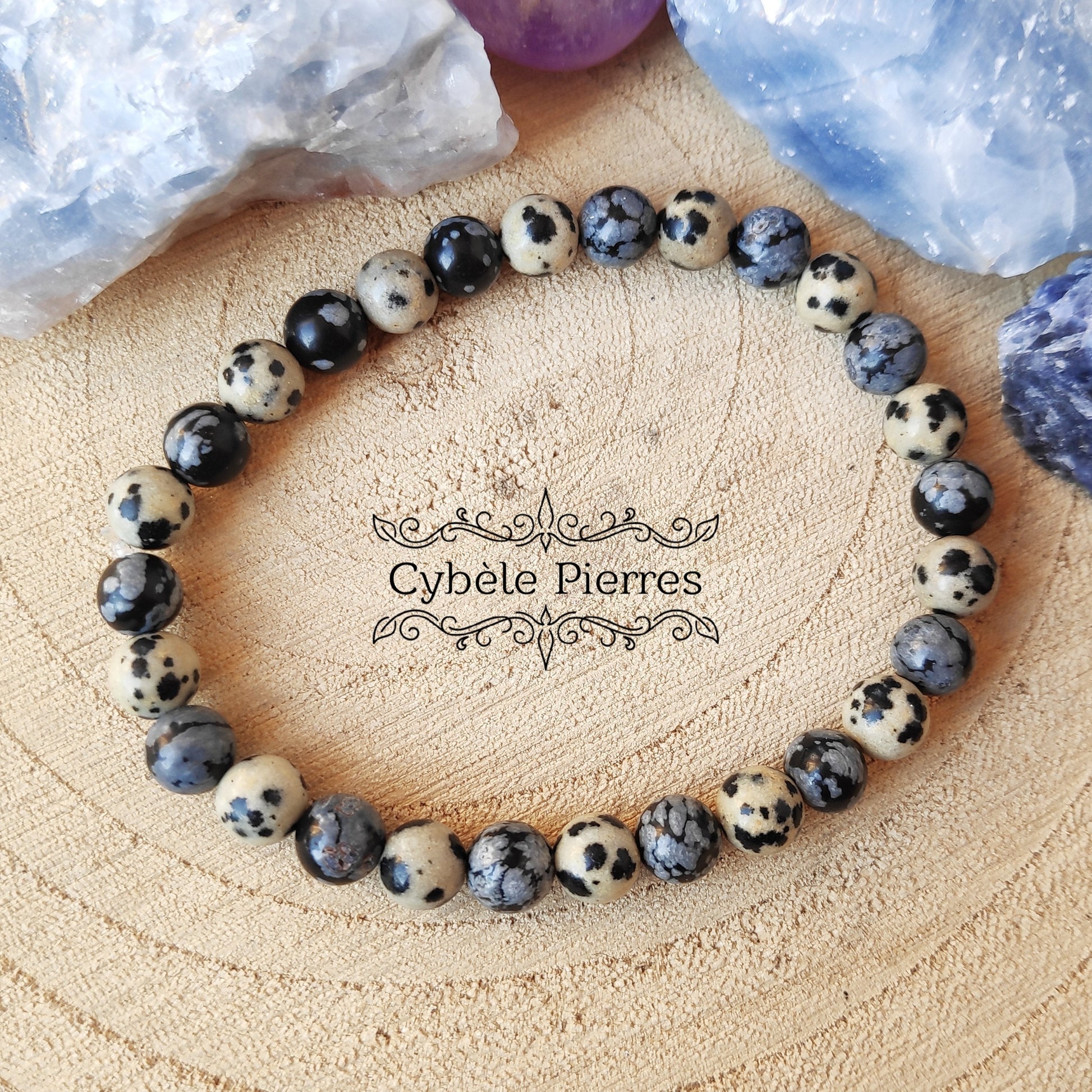 Bracelet Aboutissement - Jaspe dalmatien et Obsidienne flocons de neige (6mm) - 17cm [🔥Dernier exemplaire!]