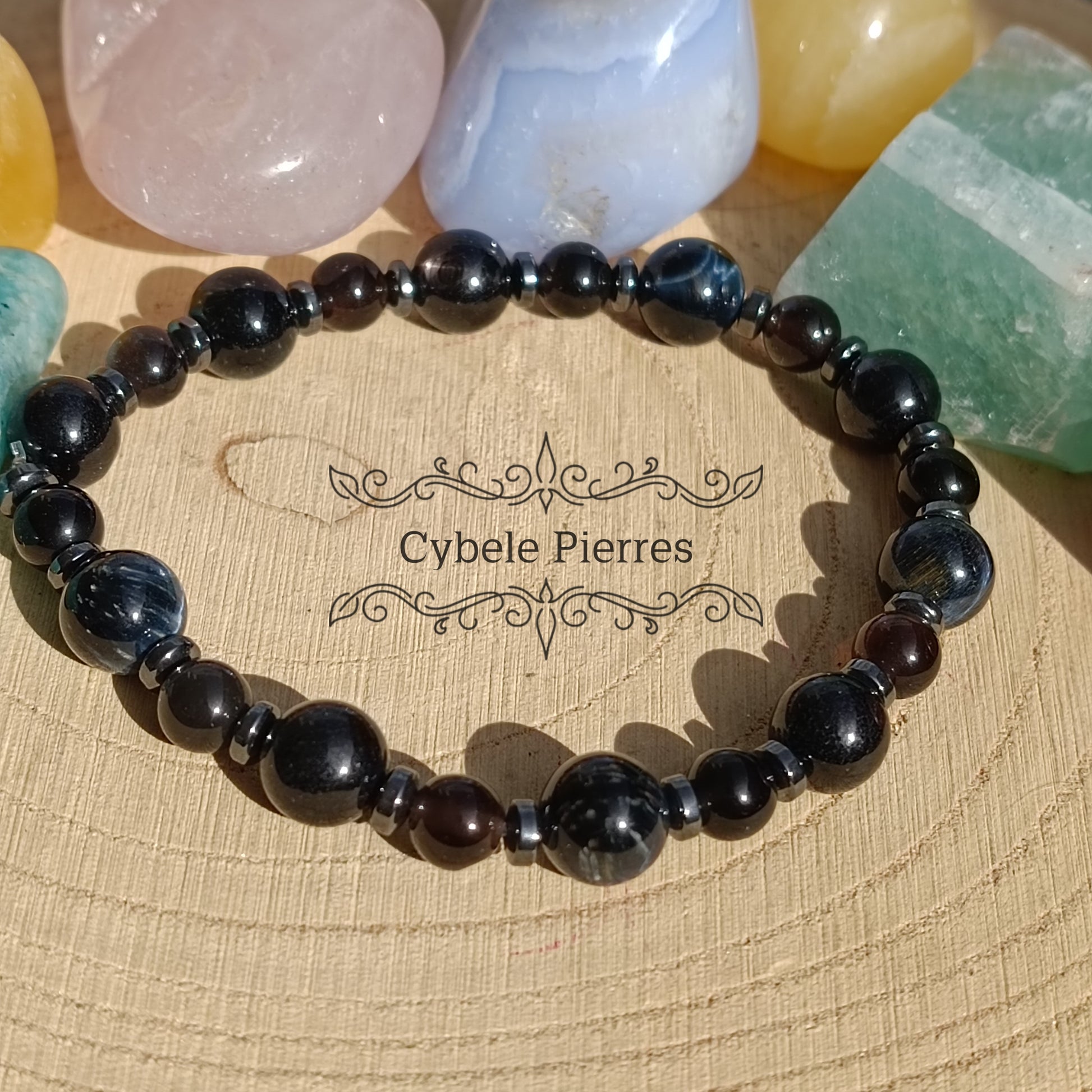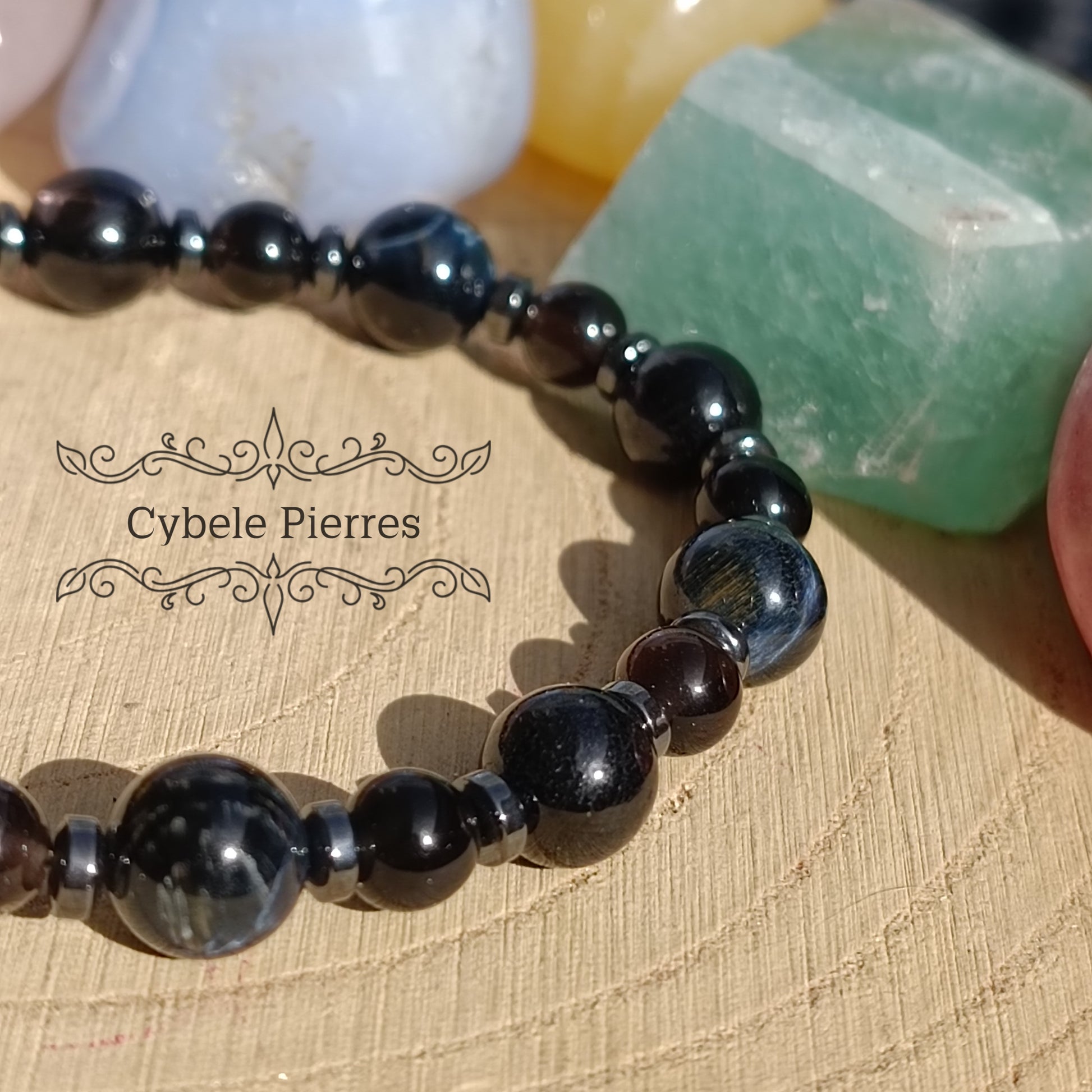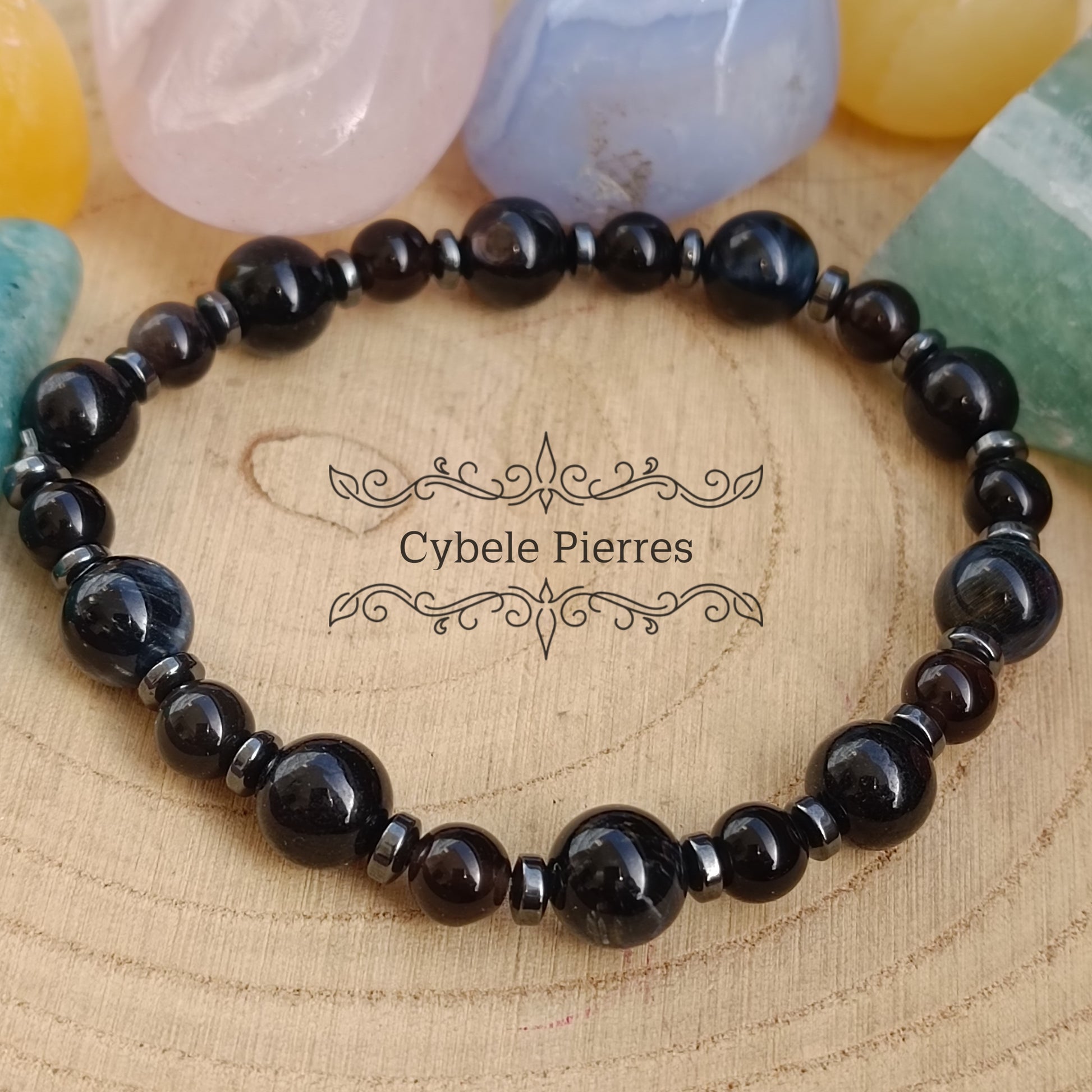 Bracelet : Hyperstène, Oeil de Faucon et Obsidienne argentée (8mm et 6mm)18cm