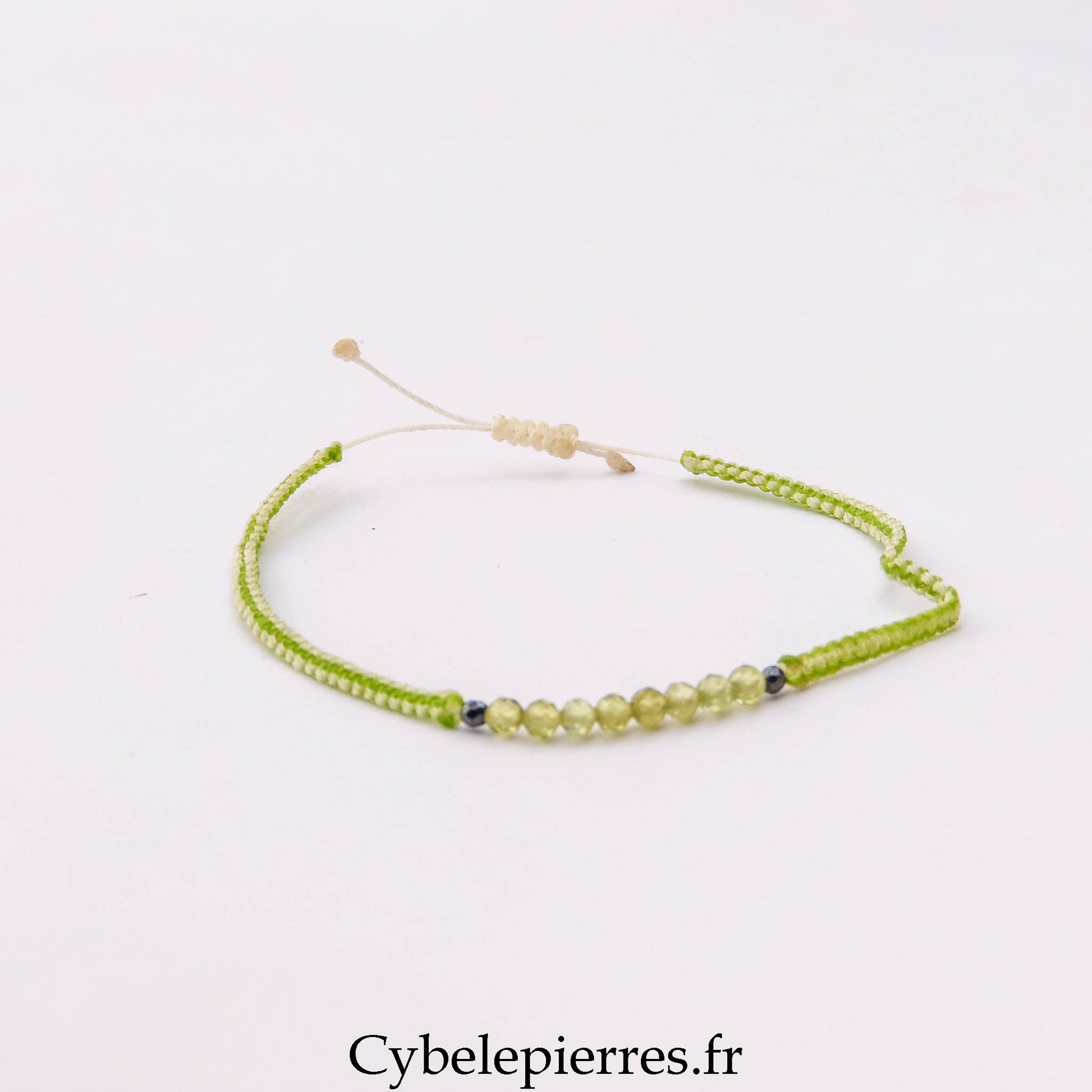 Un bracelet raffiné en micro macramé réglable, composé de fines perles de péridot facetté de 3 mm.