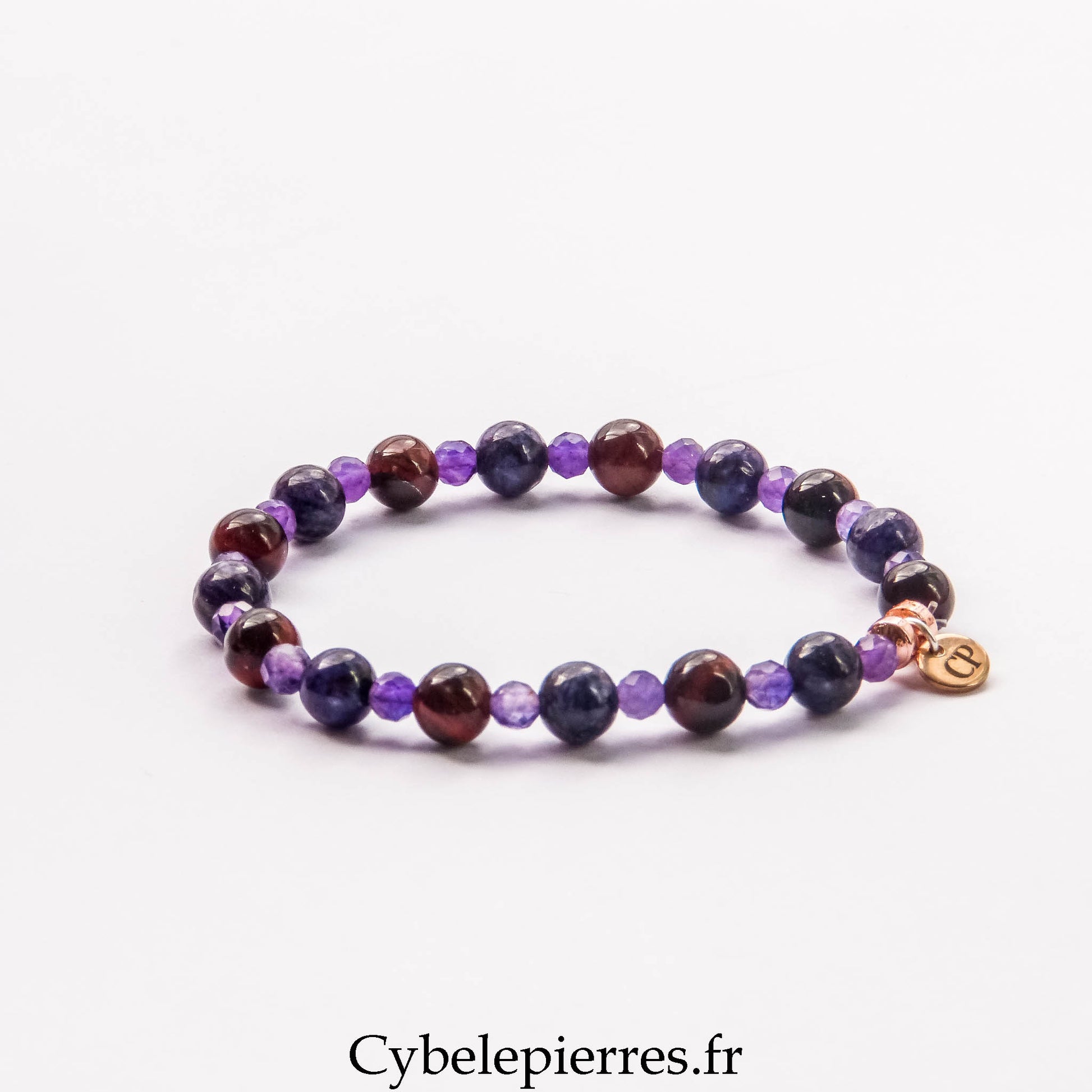 Ce bracelet de 17 cm, composé de perles de 6 mm (charoïte et œil de taureau) et de perles facettées de 3 mm (améthyste), est monté sur un fil élastique résistant. Il convient à un poignet fin.