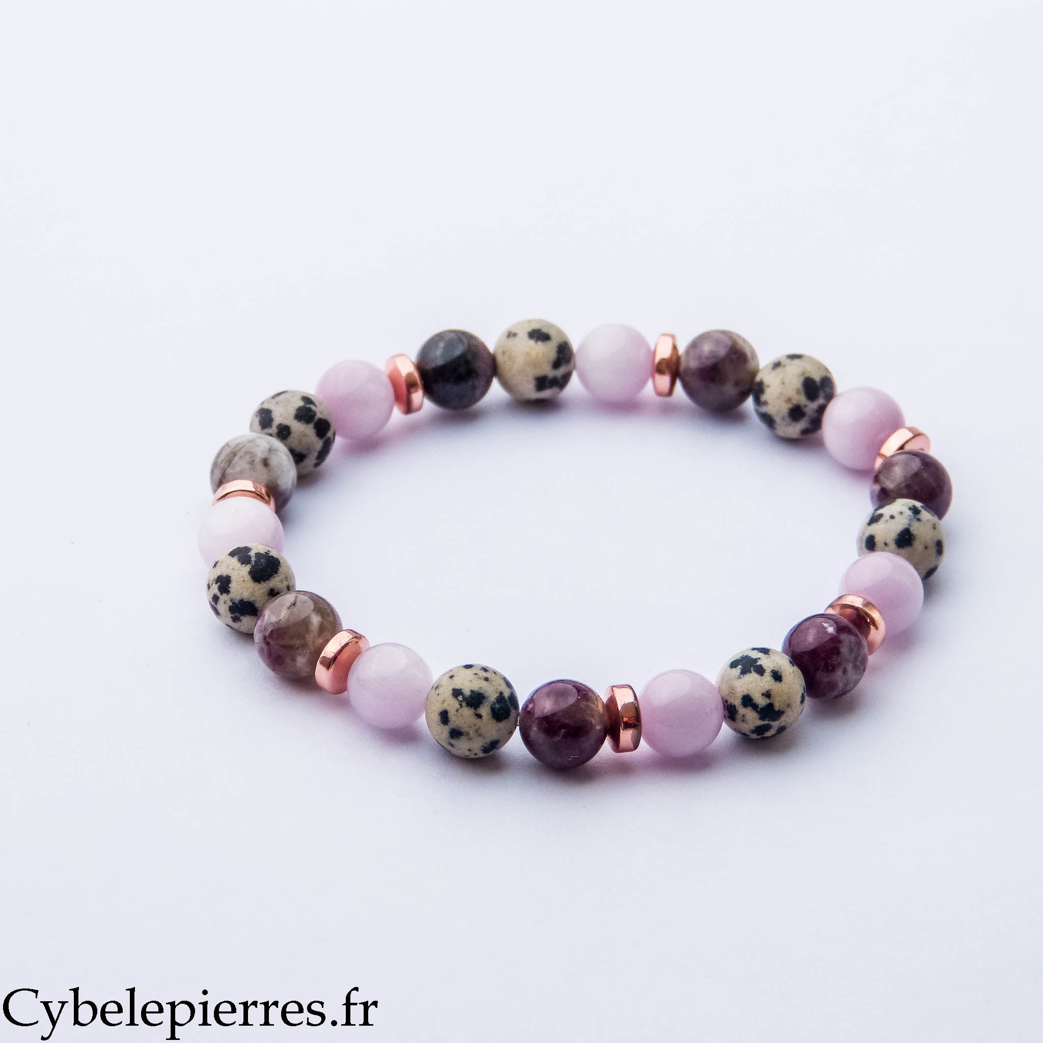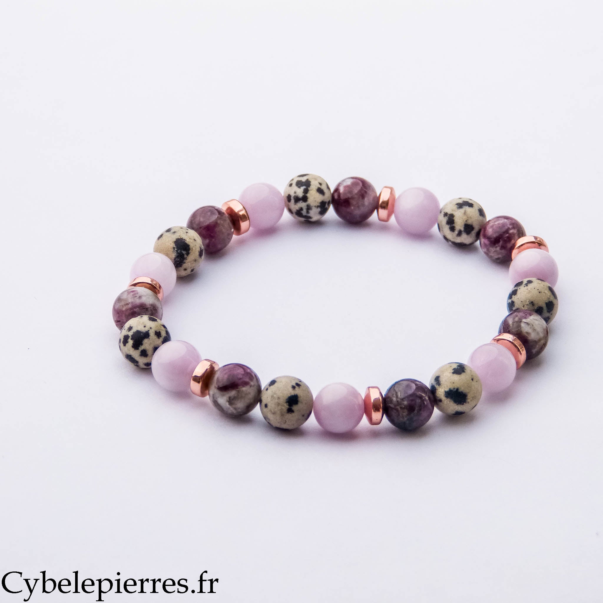 Un bracelet symbolique et élégant, composé de perles naturelles de jaspe dalmatien, rubellite et kunzite de 8 mm.