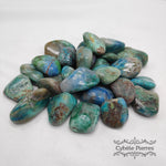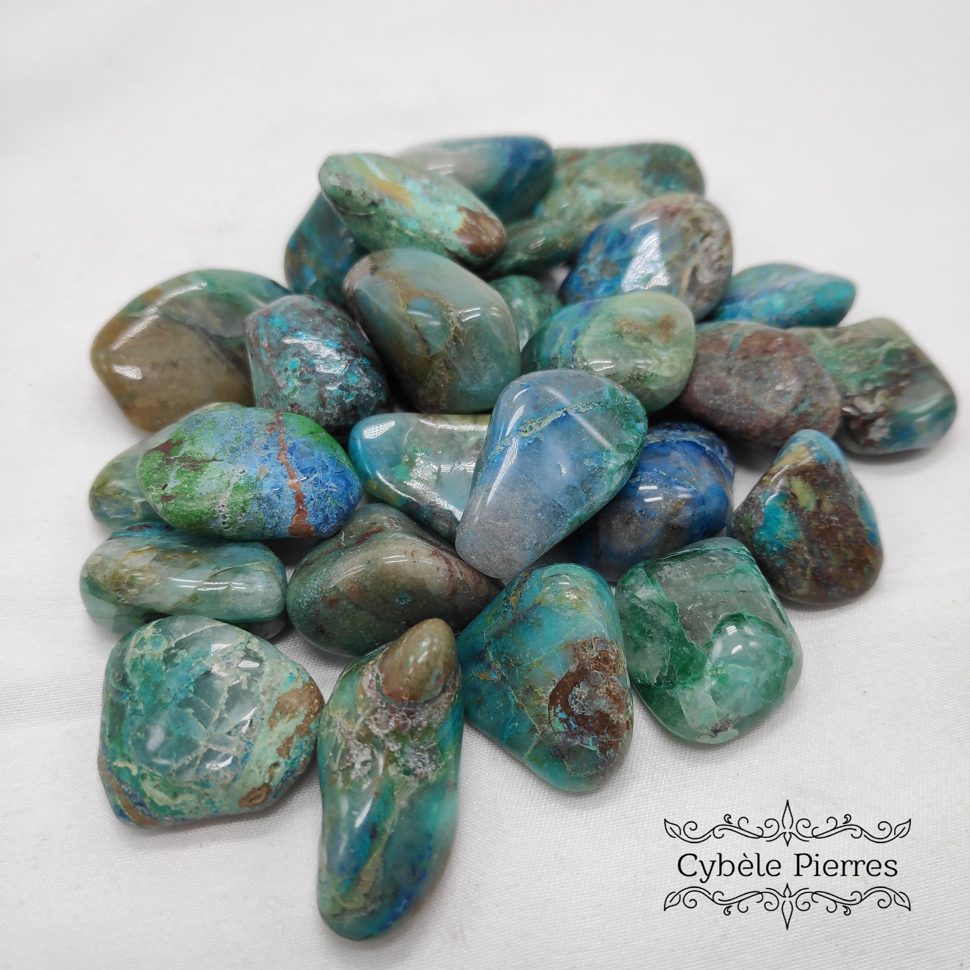Quatum Quattro (Chrysocolle Africain) : Combinaison de chrysocolle, de Shattuckite, de dioptase et de quartz fumé. Permet de libérer les traumatismes passés, chagrin et jalousie. Encourage l’acceptation et le pardon. Permet l’ancrage et protège contre les énergies importunes. Soutient l’intuition et fortifie les rêves.