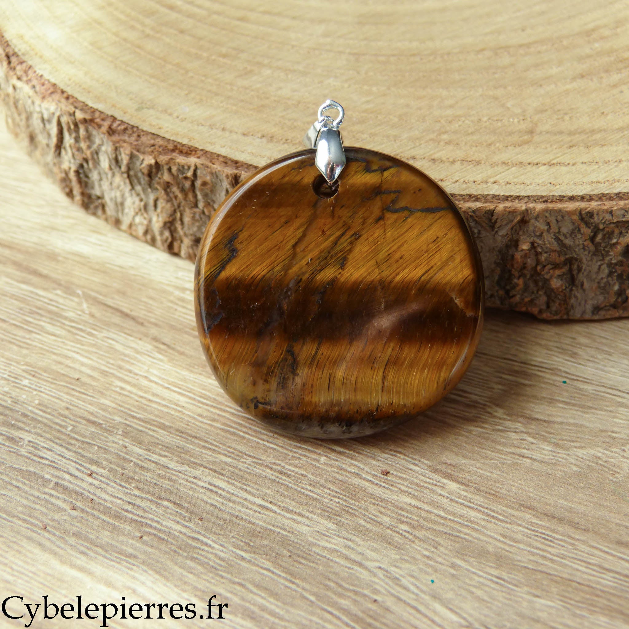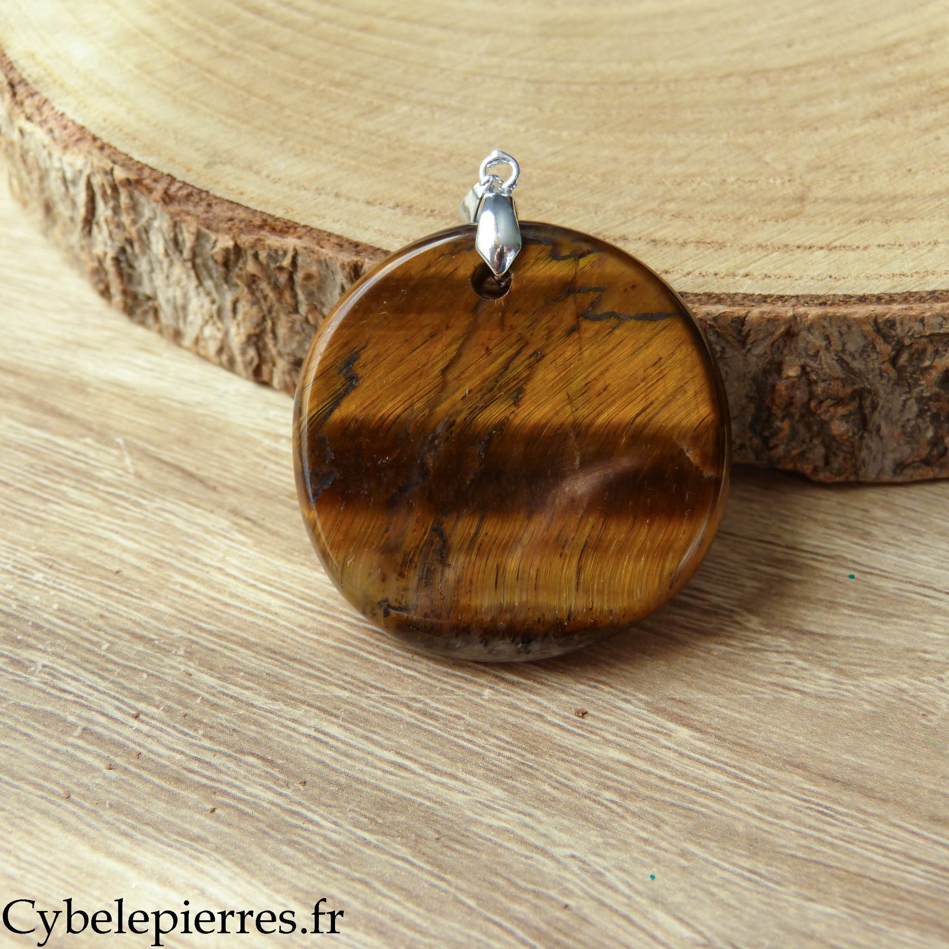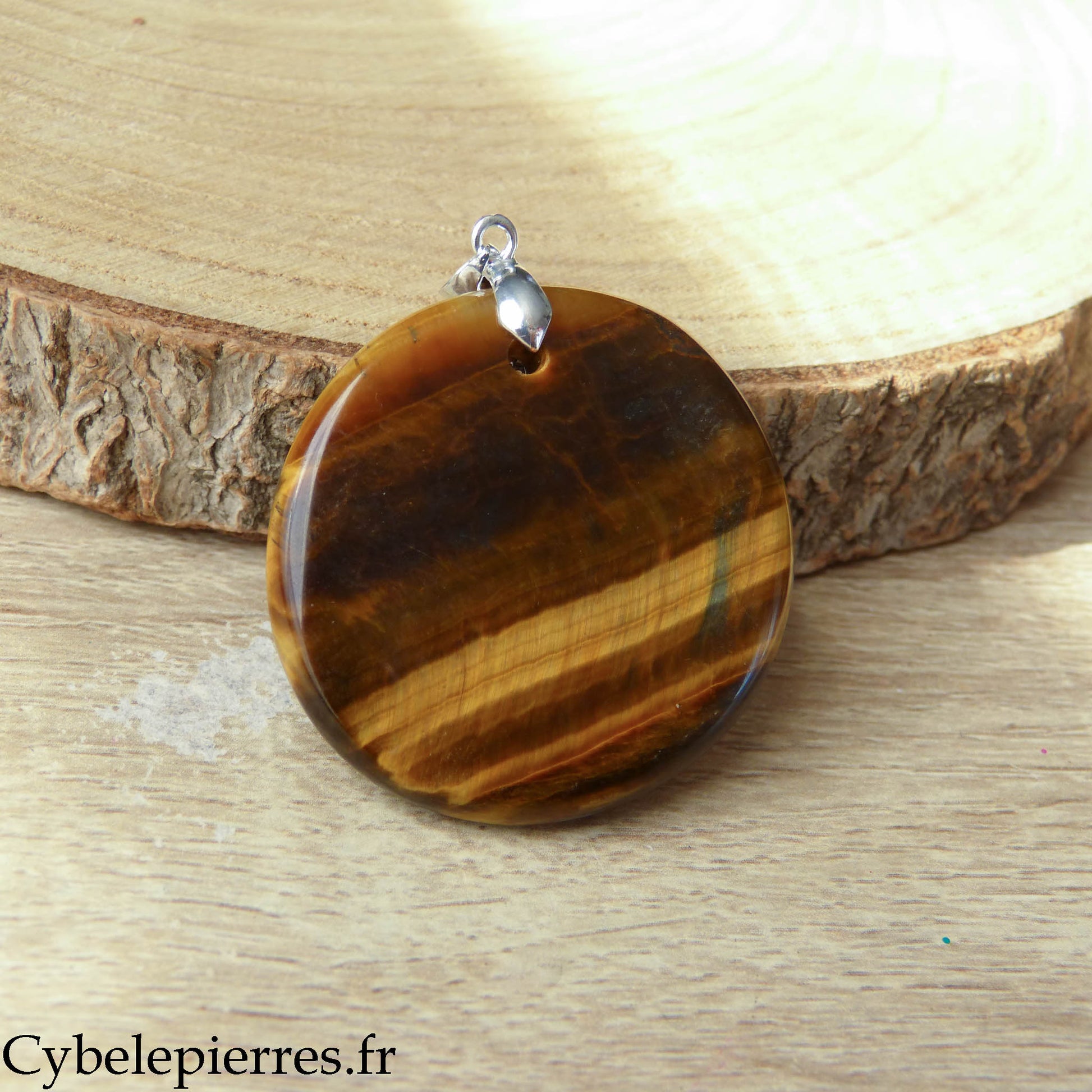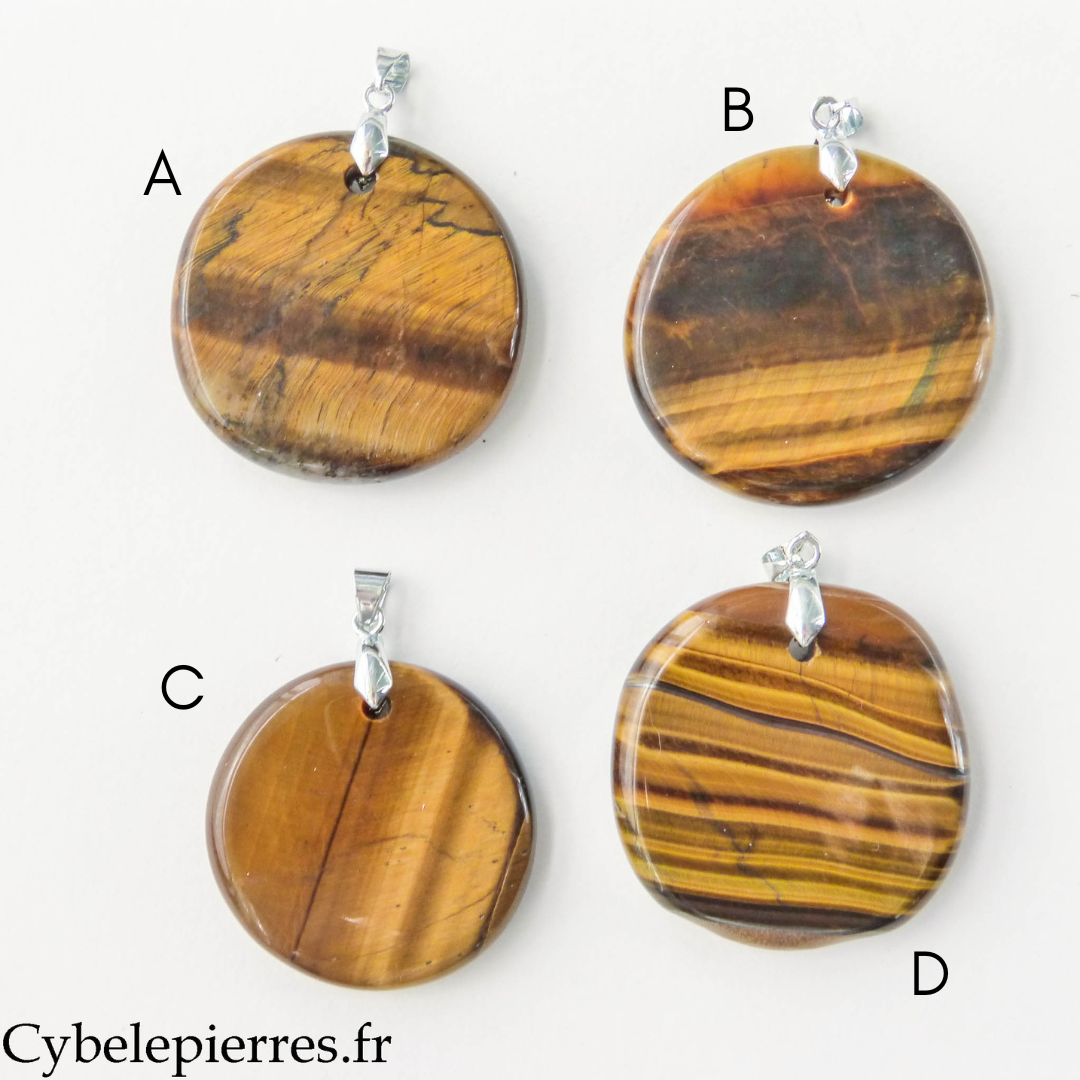 Este colgante presenta un Ojo de Tigre natural tallado en forma de disco redondo. Su gran tamaño permite apreciar bien sus reflejos iridiscentes y sus bandas de colores que cambian según la exposición a la luz.