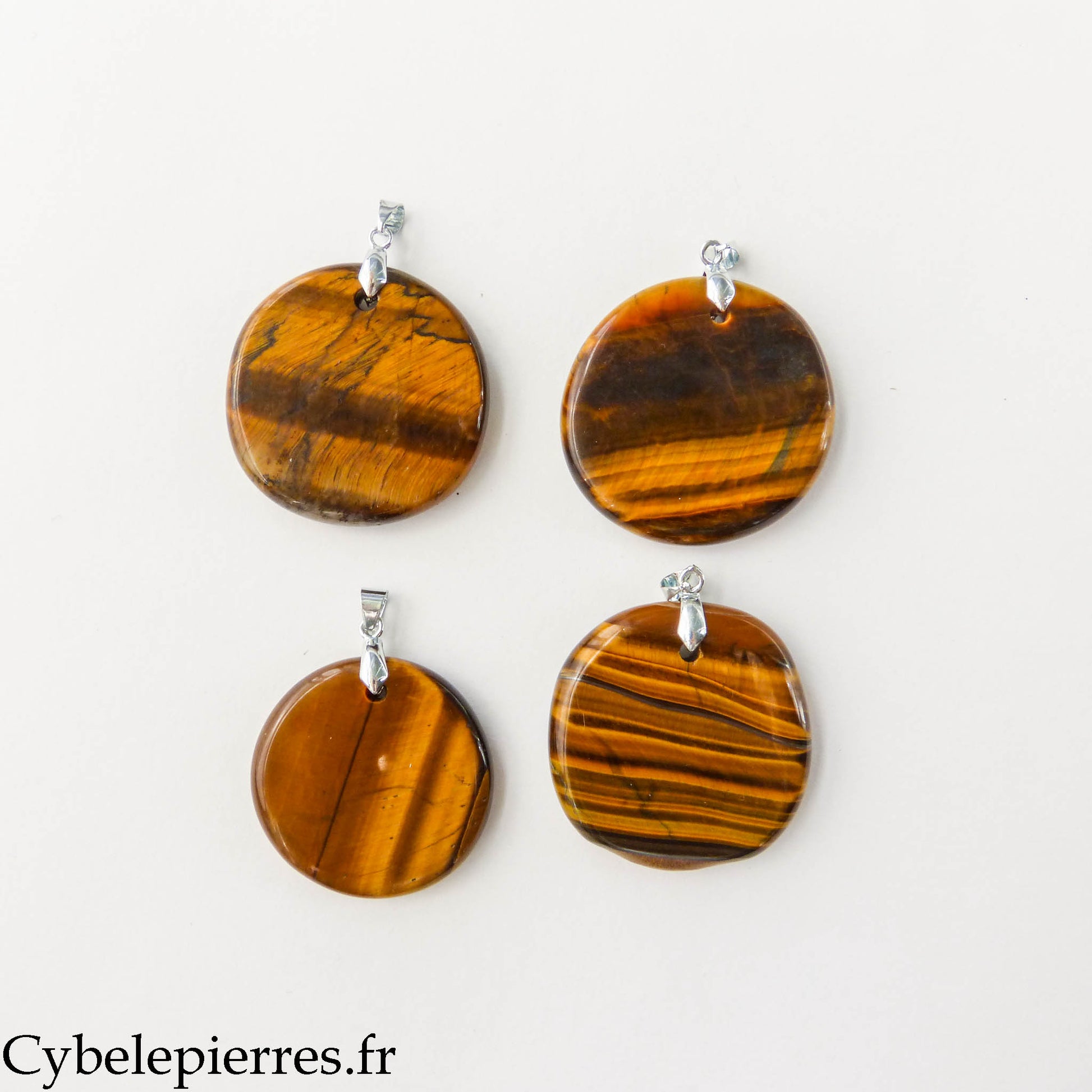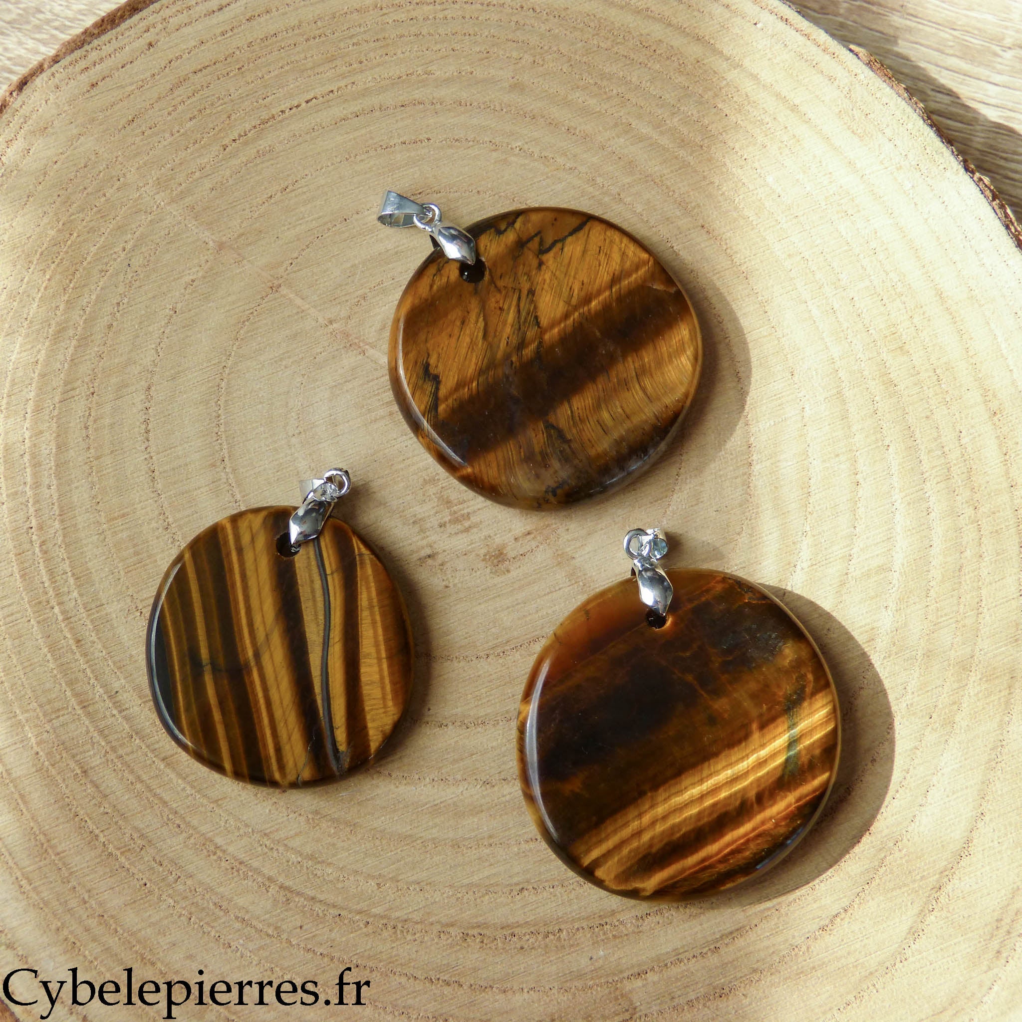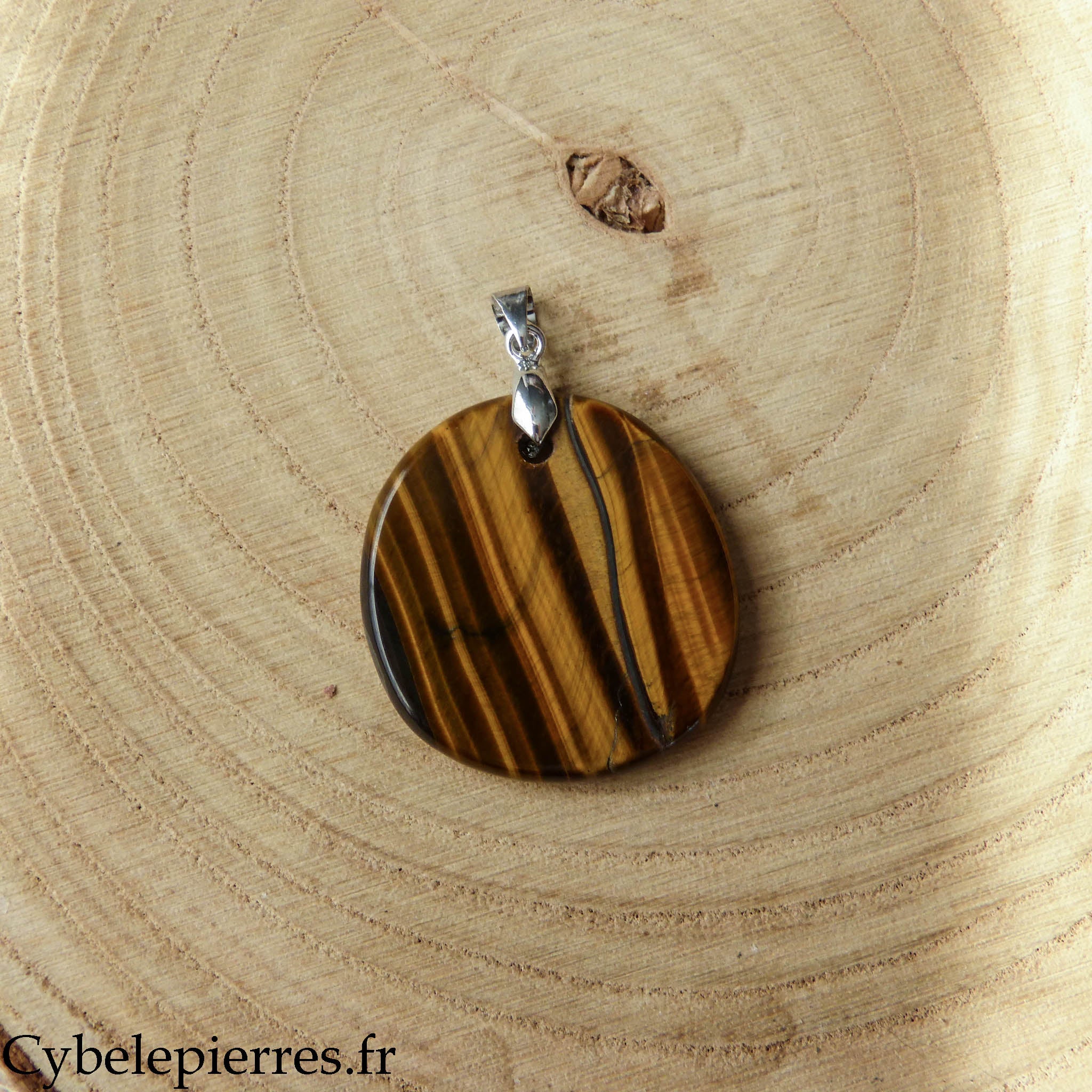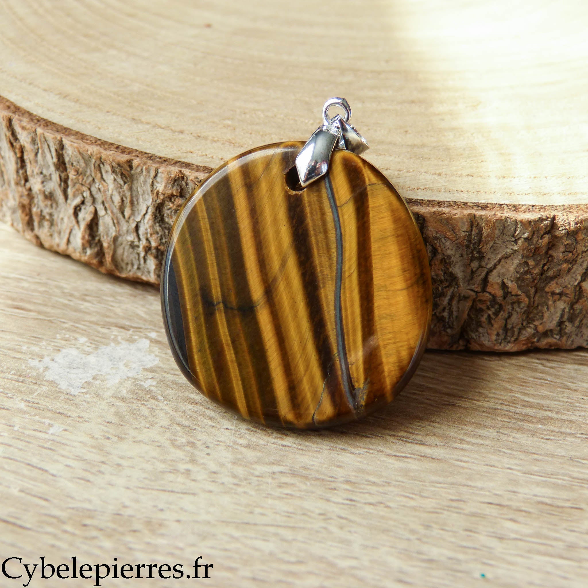 Este colgante presenta un Ojo de Tigre natural tallado en forma de disco redondo. Su gran tamaño permite apreciar bien sus reflejos iridiscentes y sus bandas de colores que cambian según la exposición a la luz.