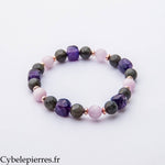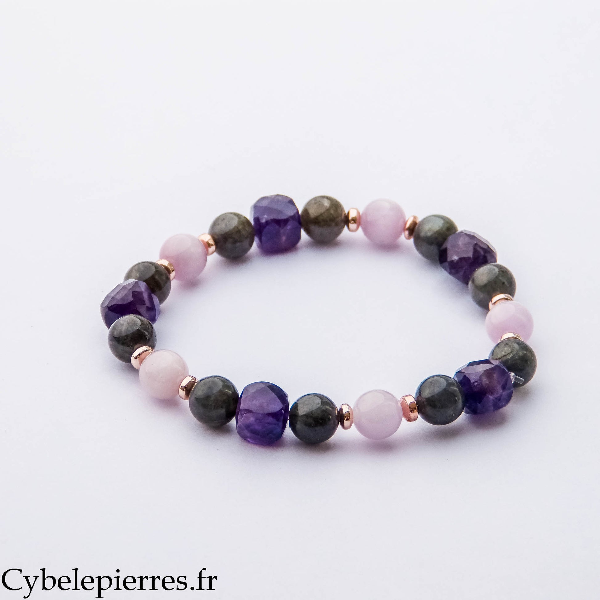 Un bracelet mystique et puissant, composé de labradorite, kunzite et améthyste carrée facettée de 8 mm.